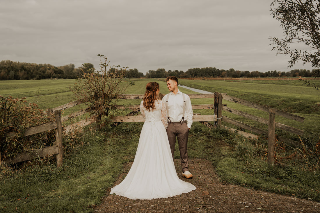 Klompen, cowboylaarzen en heel veel spelletjes. Een sfeertje dat helemaal past bij Aron & Maritte. Wat een heerlijke herfstbruiloft was dit in oktober. En even serieus, hoe tof is deze trouwlocatie!
