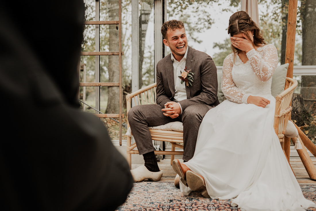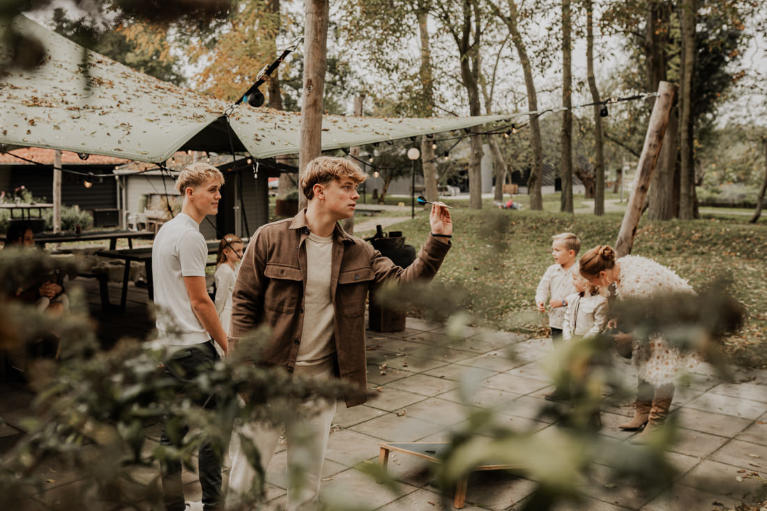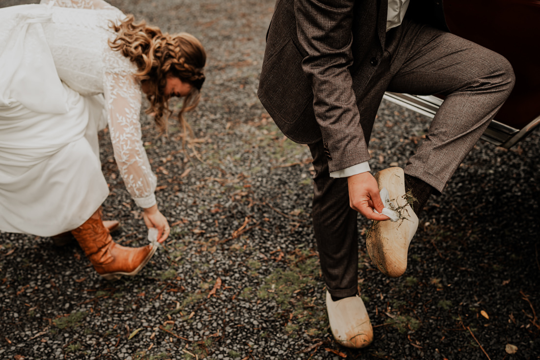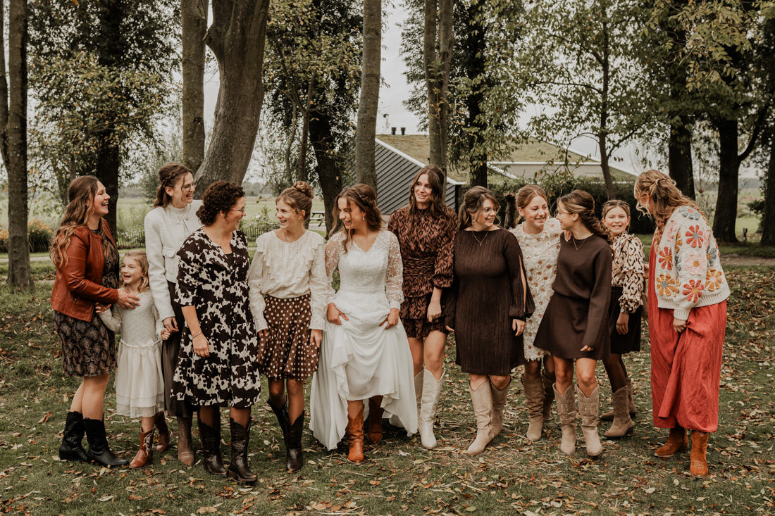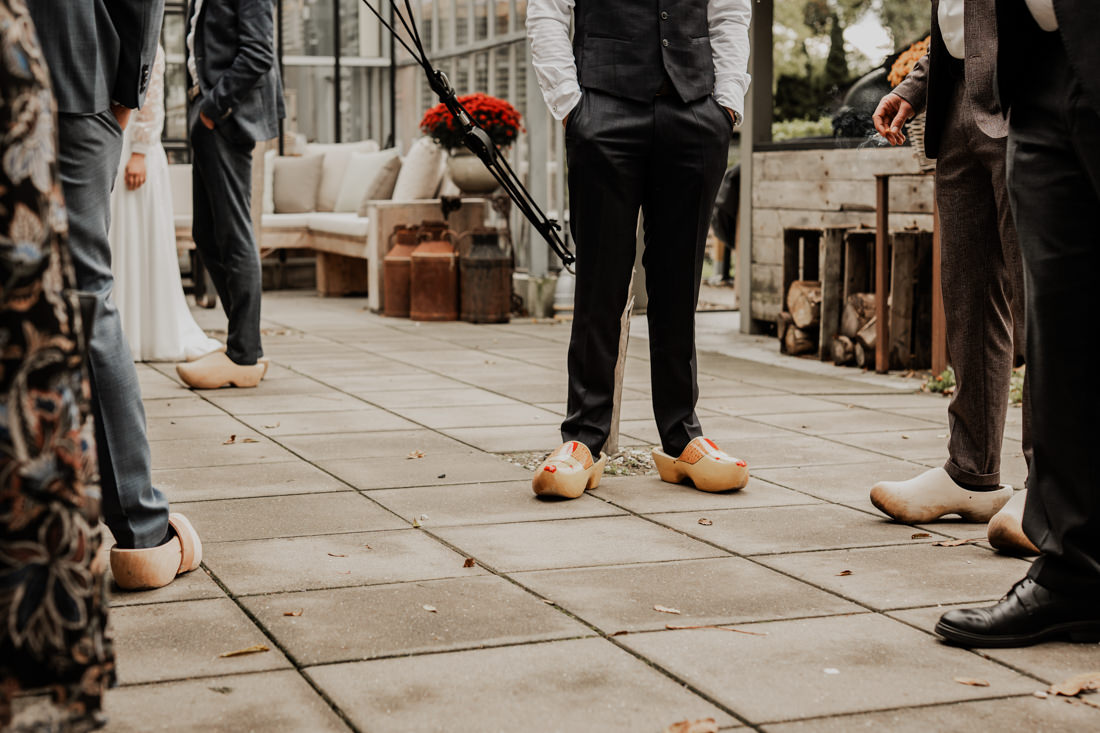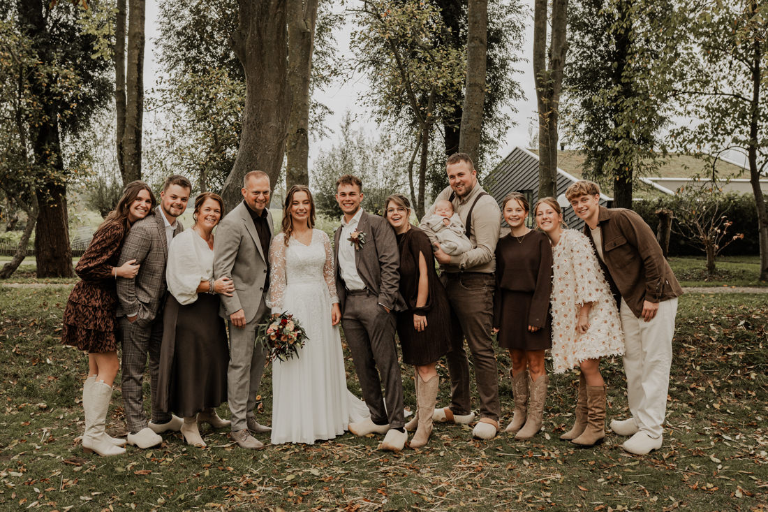 Klompen, cowboylaarzen en heel veel spelletjes. Een sfeertje dat helemaal past bij Aron & Maritte. Wat een heerlijke herfstbruiloft was dit in oktober. En even serieus, hoe tof is deze trouwlocatie!
